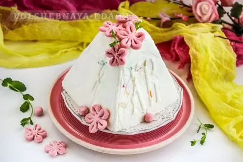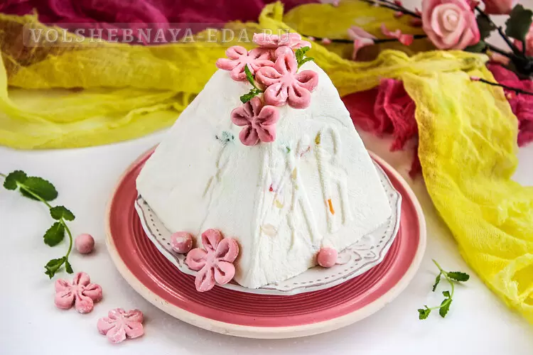 Готовую массу выложите в форму для пасхи, дно и стенки которой рекомендуется предварительно выстелить марлей, смоченной в воде и отжатой. Слегка прижимая, покройте массу чем-то тяжелым и уберите в холодильник на ночь, чтобы стекла лишняя сыворотка. Украсить десерт можно по своему усмотрению: сахарными фигурками, посыпками, а для особого вкуса — полив растопленным шоколадом.
