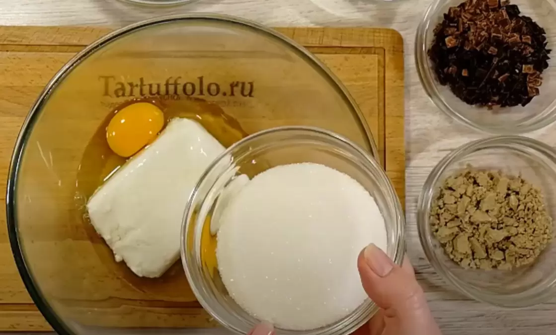 Сначала необходимо разогреть духовку до 180 градусов. В чашу кладут творог, добавляют яйца и сахар. Для создания сладкого послевкусия добавляется щепотка ванилина. После тщательного смешивания венчиком или миксером добавляют слегка растопленное сливочное масло и перемешивают до однородной массы.
