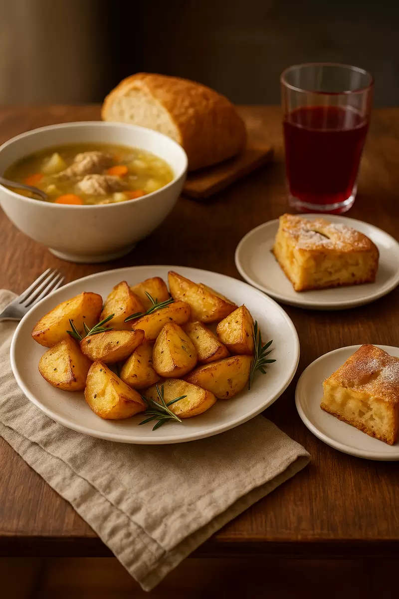 Как правило, воскресный обед не обходится без картошки — запеченной, жареной или пюре. Это настоящий символ уютного стола. Запеченная картошка с чесноком и розмарином станет отличным дополнением к любому блюду. Для этого нужно просто нарезать клубни на крупные дольки, сбрызнуть их оливковым маслом и запекать в духовке при 200°C около 35–40 минут.