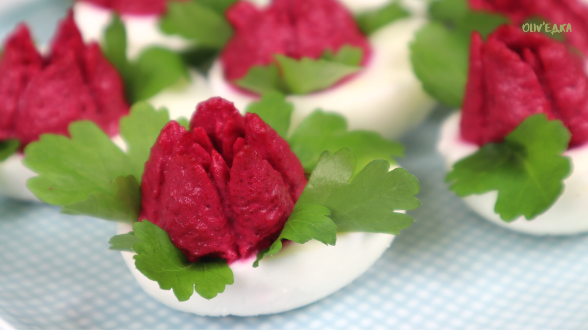 3. Формирование тюльпанов. Наполните яичные белки получившимся кремом с помощью кондитерского мешка, используя насадку «Тюльпан». Для добавления яркости и свежести можно украсить тюльпаны листиками петрушки, аккуратно прикрепив их зубочисткой.