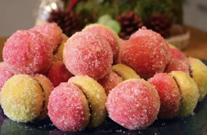 Эти печенья готовят на все важные события: от Рождества до свадеб. На любом празднике на столе можно увидеть аппетитную горку “персиков”, которая не оставит равнодушным никого.