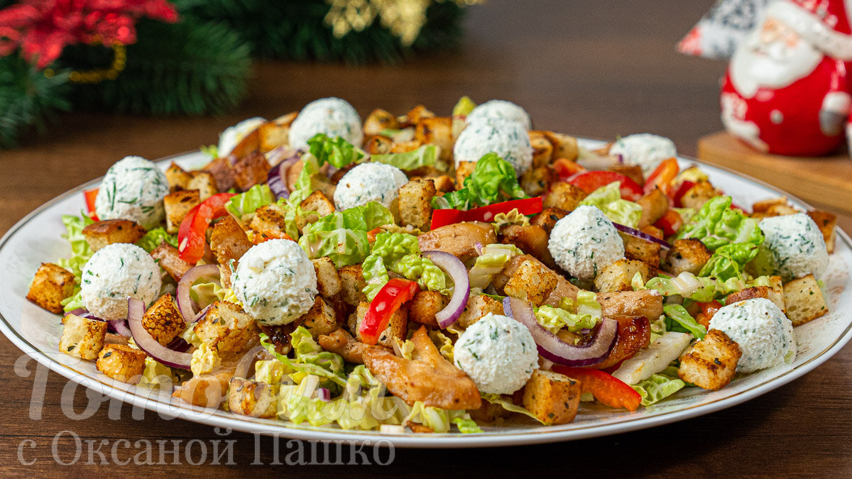 Представляем вашему вниманию легкий и невероятно вкусный новогодний салат, который обязательно впишется в любой праздничный стол. Этот уникальный рецепт порадует всех любителей кулинарных новинок. Салат получается свежим, умеренно сытным и очень аппетитным. Прекрасно сбалансированные свежие овощи и нежное обжаренное мясо гармонично дополняются оригинальной заправкой из апельсинового сока, хрустящими сухариками и пикантными сырными шариками. Такой салат станет настоящей звездой вашего новогоднего застолья!