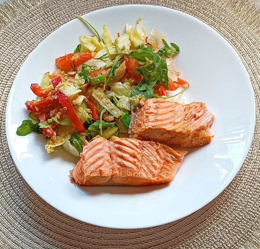 Обед: Чечевичный суп на костном бульоне с запеченной скумбрией и салатом из шпината.